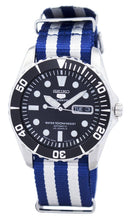 Made in Japan Stainless Steel Case Blue White NATO Strap Automatic Movement Calibre: 7S36 23 Jewels Hardlex Crystal Black Dial Luminous Hands And Marker Day And Date Display Unidirectional Rotating Bezel See Through Case Back Buckle Clasp 100M Water Resistance Approximate Case Diameter: 45mm Approximate Case Thickness: 13mm