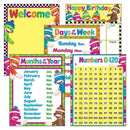 Create inviting, exciting spaces with playful characters and lots of learning! Convenient five-chart pack for Grades PK-3 includes Sock Monkeys charts: Welcome, Happy Birthday, Days of the Week, Months of the Year, and Numbers 0-120. Extra Value: Reproducibles on back. Durable. 17" x 22". Coordinates with Sock Monkeys Collection.