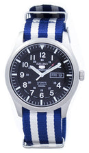 Made In Japan Stainless Steel Case Blue White NATO Strap Automatic Movement Caliber: 7S36 23 Jewels Hardlex Crystal Black Dial Luminous Hands And Indexes Day And Date Display See Through Case Back Buckle Clasp 100M Water Resistance Approximate Case Diameter: 42mm Approximate Case Thickness: 12mm
