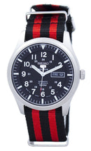 Made In Japan Stainless Steel Case Red Black NATO Strap Automatic Movement Caliber: 7S36 23 Jewels Hardlex Crystal Black Dial Luminous Hands And Indexes Day And Date Display See Through Case Back Buckle Clasp 100M Water Resistance Approximate Case Diameter: 42mm Approximate Case Thickness: 12mm