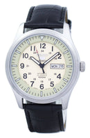Made In Japan Stainless Steel Case High Quality Ratio Brand Black Leather Strap Automatic Movement Caliber: 7S36 23 Jewels Hardlex Crystal Cream/Beige Dial 12/24 Hours Display Luminous Hands And Indexes Day And Date Display See Through Case Back Buckle Clasp 100M Water Resistance Approximate Case Diameter: 42mm Approximate Case Thickness: 12mm