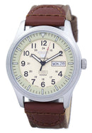 Made In Japan Stainless Steel Case Canvas Strap Automatic Movement Caliber: 7S36 23 Jewels Hardlex Crystal Cream/Beige Dial 12/24 Hours Display Luminous Hands And Indexes Day And Date Display See Through Case Back Buckle Clasp 100M Water Resistance Approximate Case Diameter: 42mm Approximate Case Thickness: 12mm