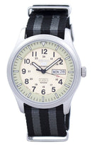 Made In Japan Stainless Steel Case Grey Black NATO Strap Automatic Movement Caliber: 7S36 23 Jewels Hardlex Crystal Cream/Beige Dial 12/24 Hours Display Luminous Hands And Indexes Day And Date Display See Through Case Back Buckle Clasp 100M Water Resistance Approximate Case Diameter: 42mm Approximate Case Thickness: 12mm