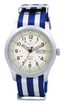 Made In Japan Stainless Steel Case Blue White NATO Strap Automatic Movement Caliber: 7S36 23 Jewels Hardlex Crystal Cream/Beige Dial 12/24 Hours Display Luminous Hands And Indexes Day And Date Display See Through Case Back Buckle Clasp 100M Water Resistance Approximate Case Diameter: 42mm Approximate Case Thickness: 12mm