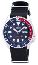 Made In Japan Stainless Steel Case Black NATO Strap Automatic Movement Caliber: 7S26 21 Jewels Hardlex Crystal Dark Blue Dial Red And Blue Bezel Day And Date Display Luminous Hands And Markers Buckle Clasp 200M Water Resistance Approximate Case Diameter: 42mm Approximate Case Thickness: 13mm
