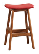 A remarkable combination of minimalism and elegance. This contemporary style counter height stool is sure to enliven your living space. Constructed from wood and seats upholstered in leather, this counter height stool offers a comfortable seating experience. The seat is finished in a red color and incorporates brown wooden legs, with a robust structure and support.