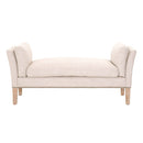 Trendy yet timeless, casual yet elegant- this upholstered Bench is the perfect combination of everything desired in a dining seat. It features a stone wash oak frame with a bisque-colored, French linen upholstered seat. A gold nailhead trim wraps around the border of the fabric seat. Dimensions: W:60" D:21" H:28"
