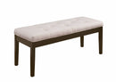 This bench is anchored with a dark espresso finished wood frame and legs with button tufted, beige linen upholstered seat. This bench works in any entryway, at the foot of a bed, or even in your dining room or kitchen when paired with other furniture set. Add a bit of color and seating with this beautiful bench.