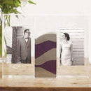 This unique photo and sand ceremony shadow box features not only a separate compartment for the bride and groom to fill with sand, but also two compartments designed to hold standard 4" X 6" ~ 10.2 cm X 15.2 cm photos. Simply place the photos between the two layers of acrylic provided and slide into position. Stylish etching will provide beautiful framing to complete the look. Following the wedding, this will make the perfect keepsake that can be displayed in your home and enjoyed for years to come. Compartment holds 2 bags of sand and the top has a piece that slides in and out to keep sand secure. Colored sand and pouring vases sold separately. Materials: Acrylic