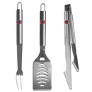 Our Boise St. Broncos stainless steel 3 pc BBQ tool set includes a large spatula with built in bottle opener, heavy duty tongs, and large fork. All the tools feature a team logo on the handle.Officially licensed College product Licensee: Siskiyou Buckle. Tools are 420 grade stainless steel. Set includes: spatula, fork and tongs. The heavy duty spatula features a bottle opener and serrated edge. Boise St. Broncos emblem on each tool