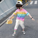 2 Pcs Boys Rainbow Striped Print Tops And Lace-up Pants Set