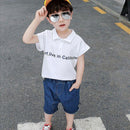 2 Pcs Boys Shark Print Short Sleeves And Denim Shorts