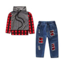2 Piece Set Boys Plaid Print Long Sleeves Hoodies And Ripped Jeans