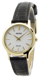 Gold Tone Stainless Steel Case Black Leather Strap Solar Powered Caliber: V115 Hardlex Crystal White Dial Batons Dial Markers Power Reserve Buckle Clasp Solid Case Back Push/Pull Crown 30M Water Resistance Approximate Case Diameter: 26.1MM Approximate Case Thickness: 6MM --- Authentic Watch --- 1-Year International Warranty --- Free Shipping
