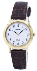 Gold Tone Stainless Steel Case Leather Strap Solar Movement Caliber: V115 Hardlex Crystal White Dial Analog Display Pull/Push Crown Buckle Clasp 30M Water Resistance Approximate Case Diameter: 26mm Approximate Case Thickness: 5.6mm