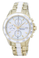 Gold Tone Stainless Steel Case Gold Tone Stainless Steel Bracelet With White Ceramic Center Links Quartz Movement Caliber: 7T92 Sapphire Crystal Mother Of Pearl/White Dial Analog Display Chronograph Function Tachymeter Scale Luminous Hands And Markers Date Display Pull/Push Crown Fold Over Clasp 100M Water Resistance Approximate Case Diameter: 38mm Approximate Case Thickness: 10mm