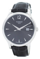 Stainless Steel Case Leather Strap Swiss Quartz Movement Caliber: ETA F06.111 Scratch Resistant Sapphire Crystal Grey/Black Dial Silver Tone Hands And Markers Date Display Pull/Push Crown Solid Case Back Buckle Clasp 30M Water Resistance Approximate Case Diameter: 42mm Approximate Case Thickness: 7.47mm