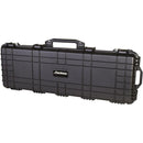 Ultradurable, fiberglass-infused polypropylene construction; Pluck foam; Weatherproof gasket; Pressure release valve; High-density rubber wheels; 3 carry handles; 4 secure latches; Meets TSA & airline safe requirements; Includes anticorrosion Zerust(R) tab; Interior dim: 42inchL x 13.5inchW x 5inchD; Black;