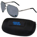 Aviator sunglasses are truly an iconic retro fashion statement that never goes out-of-style. Our Carolina Panthers aviator sunglasses pair this classic look with your love of the game. The iridium coated lenses reduce glare while driving, boating, golfing and their 100% UVA/UVB rating provides you with the maximum UV protection for all your outdoor activities. A millennial favorite, these affordable designer frames are the perfect eyewear accessory for a sports fan that is looking for high-quality at an affordable price. The durable, flex hinged frames are tough enough for hiking and camping or if you prefer sun bathing by the pool or on the beach these shades will really stand the test of time. The sunglasses come with a hard shell zippered case which has a large team logo on the lid that will make even the most die-hard fan proud!Officially licensed NFL product Licensee: Siskiyou Buckle. Comes with a zippered case with microfiber interior and large team logo on the lid. Maximum UVA/UVB protection for all outdoor activities from sun bathing by the pool or an the beach to blocking those sun rays on game day. The high-quality frames feature flexible hinges that help prevent breakage and make the sunglasses more comfortable to wear. No die-hard fan's outfit is complete without these Carolina Panthers aviator sunglasses