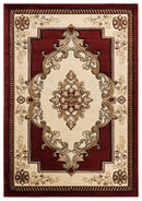 This royally grand rug is a timeless piece to add to your interior design. This classic rug is filled with shades of Burgundy Olefin/Polypropylene red, gold and beige. Using an intricate design and a large medallion in the middle, this floor covering will be the highlight of your room decor. This machine-made rug has a hand carved design and is stain and fade resistant for your lifestyle needs.