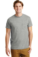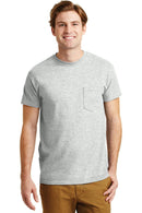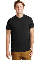 Gildan Ultra Blend 50/50 Cotton Poly Pocket T-Shirt. 8300 _ 5.6-ounce, 50/50 Cotton poly _ Seamless collar _ Taped neck and shoulders _ Double-needle sleeve and hem _ Double-needle 5-point left chest Pocket Adult Sizes: S _3XL