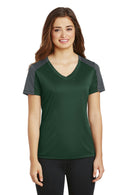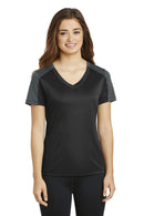 Sport-Tek Ladies PosiCharge Competitor Sleeve-Blocked V-Neck Tee. LST354 Contrast sleeve blocking enhances the athletic look of our colorfast, moisture-wicking, value-priced essential. 3.8-ounce, 100% polyester interlock with PosiCharge Technology Gently contoured silhouette Removable tag for comfort and relabeling Self-fabric V-neck Set-in sleeves