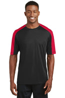 Contrast sleeve blocking enhances the athletic look of our colorfast moisture-wicking value-priced essential. 3.8-ounce 100% polyester interlock with PosiCharge Technology Removable tag for comfort and relabeling Set-in sleeves