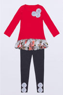 Long Sleeve Red Hi-Lo Top with Chiffon Silver Ruffle on the Bottom and Grey Flowers