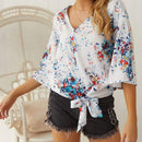 Women V Neck Long-sleeve Floral Print Knotted Chiffon Blouse