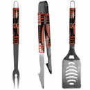 Our tailgater BBQ set really catches your eye with flashy chrome accents and vivid Cincinnati Bengals digital graphics. The 420 grade stainless steel tools are tough, heavy-duty tools that will last through years of tailgating fun. The set includes a spatula with a bottle opener and sharp serated egde, fork and tongs.Officially licensed NFL product Licensee: Siskiyou Buckle. Tools are 420 grade stainless steel. Set includes: spatula, fork and tongs. The heavy duty spatula features a bottle opener and serrated edge. Crisp chrome graphics with Cincinnati Bengals logo and colors