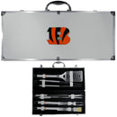 Our 8 pc BBQ set includes a spatula with knife edge, grill fork, tongs, basting brush and 4 skewers. The tools are approximately 19 inch long and have sturdy stainless steel handles. The aluminum carrying case features a metal carved Cincinnati Bengalsemblem with enameled finish.Officially licensed NFL product Licensee: Siskiyou Buckle. Heavy duty 420 grade stainless steel tools. 8 pc set includes: spatula, fork, tongs, basting brush and 4 skewers. This quality set comes in a metal team carrying case. Cincinnati Bengals emblems on the tools and large emblem on the case