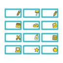 Accents feature modern icons and a serene palette. Use in multiple ways from name tags to storage labels. Each accent measures 5.5" x 3". 72 pieces (6 each of 12 designs). Coordinates with the Aqua Oasis line of products.