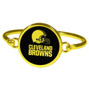 This beautiful gold toned bangle bracelet is a feminine way to show off your love of the Cleveland Browns. The bangle features an easy to use hook and eye clasp that has a large, round centerpiece that features a monochromatic, black logo. This classy look is sure to turn heads and is understated enough for everyday wear.