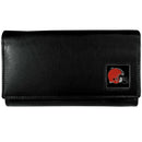 This genuine leather women's pocketbook features 9 credit card slots, a windowed ID slot, spacious front pocket, inner pocket and zippered coin pocket. The front of the pocketbook has a hand painted metal square with the Cleveland Browns primary logo. Officially licensed NFL product Licensee: Siskiyou Buckle. Genuine fine grain leather wallet. 6 credit card slots and windowed ID slot. Large zippered pocket. Metal Cleveland Browns emblem with enameled team colors