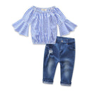 Cute Girls Cotton Stripes Printed Flare Sleeve Tops And Ripped Jeans