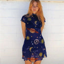 Fashion Multicolor Galaxy Printed Women Sexy Mesh Fabric Short-sleeve Turtleneck Dress