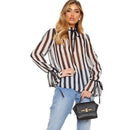 Fashion Stripes Pattern Mock Neck Flare Sleeves See-through Blouse
