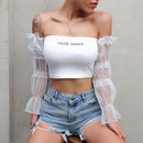 Hot Sale Women Off-she-shoulder See-Through Mesh Sleeve Letter Print Gothic Top