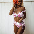 New Design Fresh Stripes Print Off-shoulder High-waisted Lace-up Two-piece Swimwear