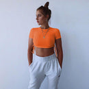 Women Fashion Round Collar Short-sleeve Neon Color Drawstring Cropped T-shirt