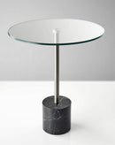 This End Table pairs sleek brushed steel with a chunky black marble base for a sophisticated, yet contemporary look. The beauty of this collection lies in the simplicity of its design, as well as the delicate details of the marble grain. A crisp glass table top finishes off the look with elegance. The approximate weight capacity for this table is about 10 lbs.
