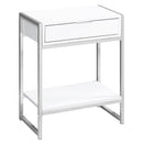 Add instant style to a room with this contemporary multi-functional side/end accent table. It features a spacious rectangular table top with an elegant glossy white finish and one large storage drawer on metal glides with a simple silver metal handle on t