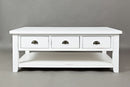 This cocktail table has a sleek and opulent look that can easily complement while drinks and magazines are lying on it. Wood constructed frame has a superb weathered white finish giving a subtle texture and sleek style to the table. This appealing table features three drawers and one shelf beneath the drawers for ostentatious look. Bring this to create a cosy corner with a couple of matching chairs to have long hours chit chatting with friends. This cocktail table is must have to give your home interior a stylish yet mid-century feel. Dimensions: 50X30X19
