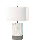 An even mix of coastal and contemporary elements, this table lamp brings a splash of on-trend style to any arrangement in your home. This luminaire features a white rectangular shade, providing a fresh taste to the entire aesthetic. Available with two different color options: satin gold or brush steel, this charming piece will sure to refresh your room and add a bright light to your space.