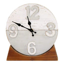 Derrick Two-Tone Wood Table Clock by is handcrafted with a fun design suiting all different styles. The three wood-tone colors of whitewash, grey, and natural wood have a wonderful coastal feel. Black metal hour-and-minute hands are easy to see, and the three-dimensional Arabic numbers have a slight shimmer as light bounces off of them. This uniquely designed clock measures 9.25" W x 2.15" D x 10" H and keeps accurate time with quartz movement. Requires 1 AA battery (not included).