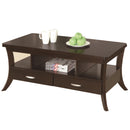 Solid frame with simple silhouette this wooden coffee table features lovely trendy flared legs in espresso brown finish. The straightforward rectangular top combined with the curvy legs makes it incredible. The table features two drawers and compartmental shelves for rendering enough space for books, essentials and accessories.