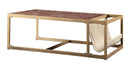 Decidedly modern design elements make this Coffee Table a striking addition to your contemporary living room. Supported by a gold finished sled style metal base, this coffee table features a top grain brown leather upholstery that is accented with unique design. An open space underneath provides a great storage to small ottomans while fabric sling works as a rack for books, magazines, newspapers, and other items. Add this coffee table to the center of your living room and make a striking statement to it. Note: Other featured items in image except this coffee table are sold separately.