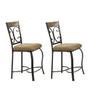 This set of counter height chairs is very appealing in its look. The metal flared legs and scrolled work design on the back gives the chair very classic appearance. The black antique finish adds to the overall look. The chairs has fabric upholstered seat which provides utmost comfort. The back has a oak brown wooden panel on the top. The contrast of black and brown gives a sophisticated look to the chairs. These chairs would surely add character to your living space.