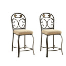 This set of counter chairs is quite appealing. The overall structure of the chair is made out of antique black finished metal. The back has scrolled work design with diamond shaped slate inserts which adds to its appeal. The cushion seat is padded with oak brown fabric. The legs of the chair are flared in the front. There is an X shaped metal strips connecting the legs. There is also a footrest which allows you to step on to sit. The chairs would surely add character to your home.