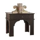 Glam up your room interior in a traditional way with this rectangular shape end table. Sturdily wood constructed, this end table features one drawer with ring pull with easy sliding mechanism. Finishes in antique espresso tone, this end table also consists wooden bracket legs providing sturdiness and its top can be used to keep table lamps, decorative vases, photo frames, etc. to give brilliance decoration. Use this end table in any room to create a stunning extraordinary look. Does not include any featured product other than one end table. Table Top: 18mm Thick